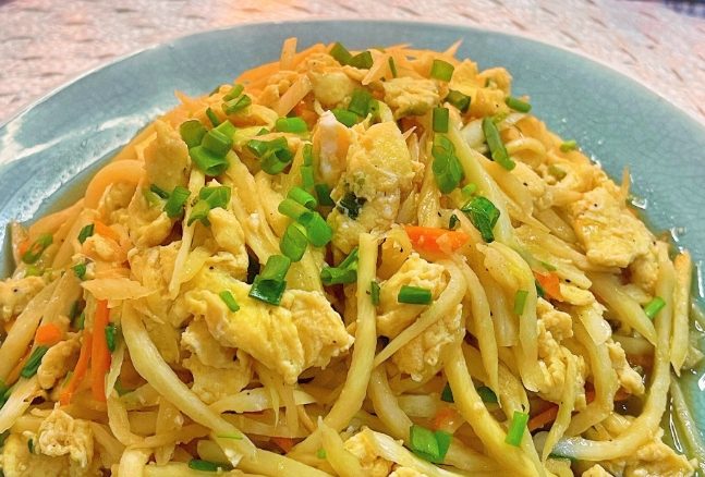 8. 完美裝盤: 動作要快!立刻把香噴噴、熱騰騰的筊白筍炒蛋盛到盤子裡。這時的蛋應該還是嫩嫩的,筍子則是爽脆中帶點柔軟。一定要趁熱吃!那撲鼻的蛋香混合著筍子的清甜,一口下去,滿嘴都是幸福的滋味。每次炒好這盤筊白筍炒蛋,白飯總是不知不覺少掉半鍋。